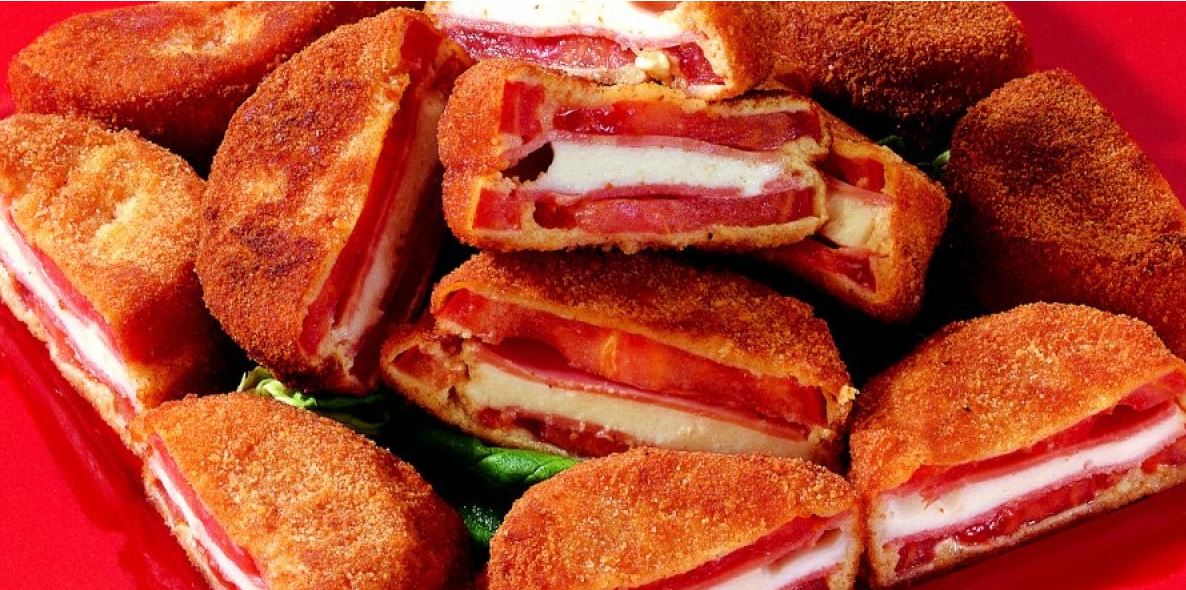 Cut each tomato into 4 round slices. Make 8 “sandwiches” using 2 circles of prosciutto and 1 circle of mozzarella between 2 slices of tomato. Dip the sandwiches in flour, then in the beaten eggs, the bread crumbs, then again in the eggs and bread crumbs (double breading). Fry them in plenty of hot oil. Cut them in half, sprinkle with salt and serve immediately.