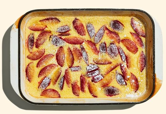 - Pulse eggs and remaining 3/4 cup granulated sugar in a food processor to combine. With the motor running, stream in half-and-half, anise liqueur, if using, and vanilla. Add flour and salt and pulse to combine. Let custard sit 10 minutes, then pour over plums.