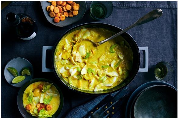- Slice 1 lime in half and squeeze juice into chowder. Taste and season with more salt if needed. Ladle into bowls, breaking fish into large pieces. Scatter celery leaves over chowder if using and top with crackers. Slice remaining lime into wedges and serve alongside.