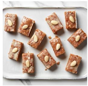 - Mark into bars by cutting into the lebkuchen about ¼ inch deep with a knife. Decorate, if desired, by placing 1 candied cherry in the center of each bar. And arrange 4 blanched almonds around each cherry.