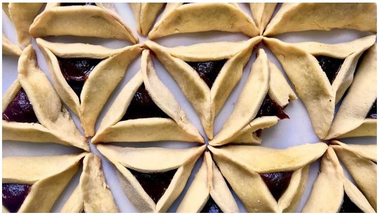 - Lightly flour a clean work surface and turn the dough out onto the surface. Press it into a cohesive mass, then use a rolling pin to roll the dough out to an even ¼-inch-thick sheet. Use a 3¾-inch round cookie cutter or the rim of a glass to punch circles in the dough. Pull the scraps away from the circles and set aside to be rerolled once. Using a tablespoon or a small scoop, portion 1 heaping tablespoon of filling into the center of each circle. Fold in the dough from three sides and press the edges together to seal, leaving a small opening over the filling. When all of the cookies are shaped, place them 2 inches apart on the prepared baking sheets.