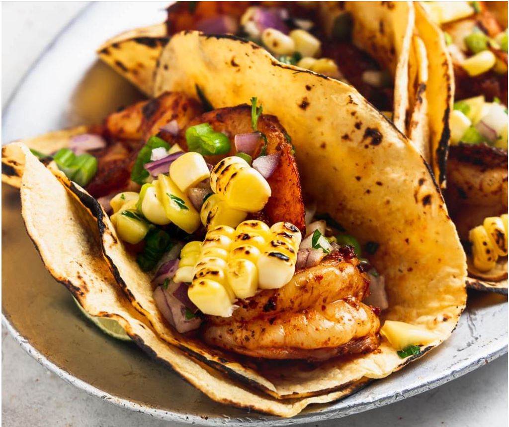 Assemble tacos with shrimp, corn and mango salsa and extra lime wedges.