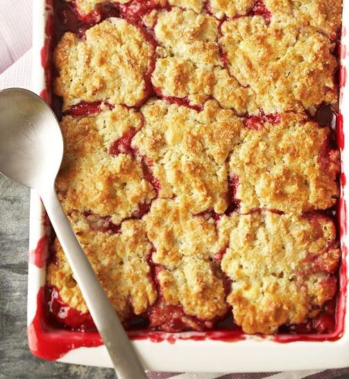 - Transfer hot filling to a 3-quart-rectangular baking dish. Using a spoon, immediately drop biscuit dough into 12 to 16 mounds on top of filling. If desired, sprinkle biscuit mounds with pearl or sanding sugar.
