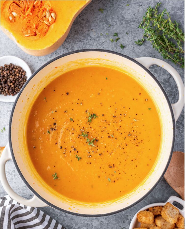 - Serve the butternut squash soup while it is still warm with bread croutons on top.