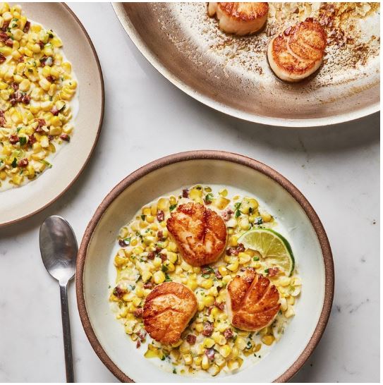 - Divide corn mixture among plates and arrange scallops on top. Serve with lime wedges for squeezing over.