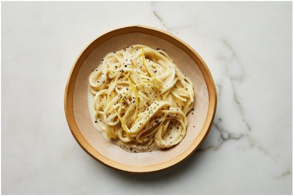 - Divide pasta among bowls. Season with pepper and top with reserved lemon zest strands.