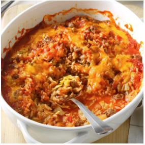 - Combine soup and water; pour over beef mixture. Cover and bake at 350° for 40-50 minutes or until rice and cabbage are tender. Uncover; sprinkle with cheese. Bake 5-10 minutes longer or until the cheese is melted.