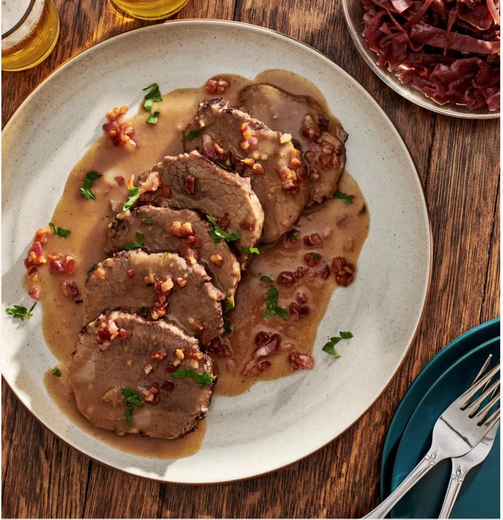 - Thinly slice the sauerbraten and transfer to a platter. Ladle with the sauce, sprinkle with the bacon and parsley, and serve hot.
