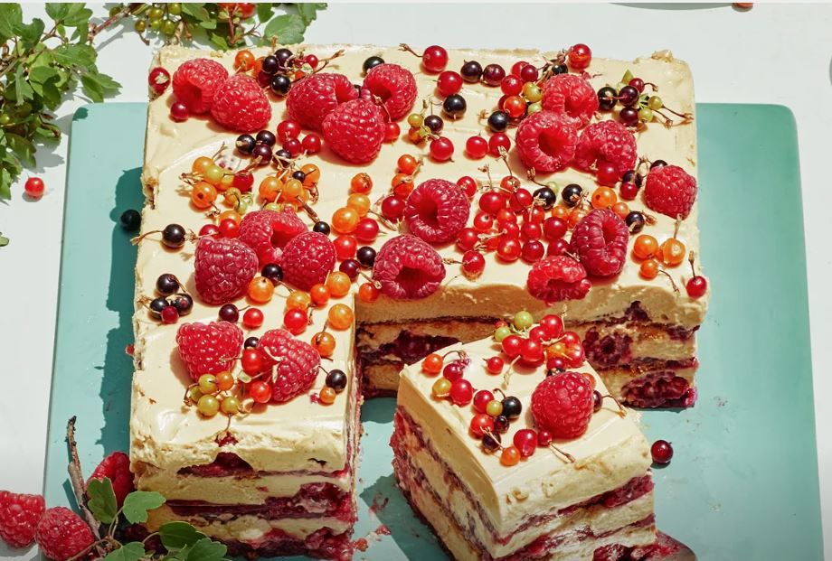 - To serve, top with more raspberries and currants (if desired) and slice, wiping knife between cuts.