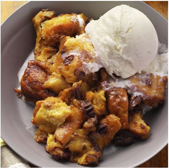 - Spoon pie filling into a greased 5- or 6-qt. slow cooker. In a large bowl, cream butter and sugar until crumbly. Add eggs, 1 at a time, beating well after each addition. Beat in milk, cinnamon and vanilla (mixture may appear curdled). Gently stir in chocolate chips and bread cubes; let stand until bread is softened, about 10 minutes. Transfer to slow cooker.